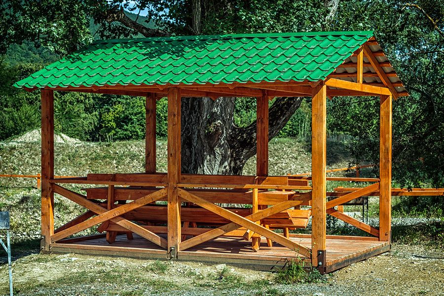 Существует некоторая хитрость для открытых беседок — между досками на полу необходимо оставлять небольшие проёмы в несколько миллиметров, через которые будет уходить вода после дождя.