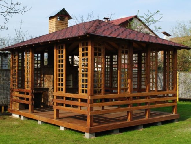 Для создания каркаса понадобится не 6 классических столбов (4 по углам и 2 для двери), а всего лишь 5. Последние два будут основой для входа, то есть парадная сторона будет угловая. Интересное архитектурное решение, которое нечасто встречается в подобных беседках.