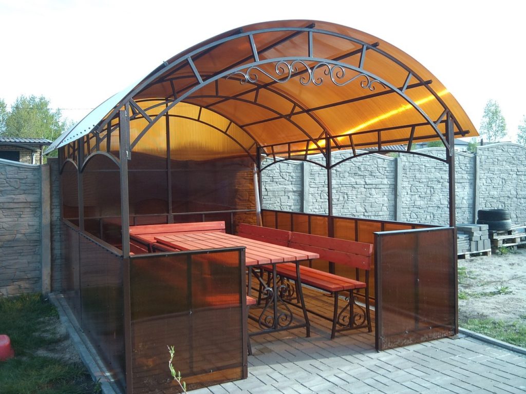Особое внимание я бы уделил постройкам с декоративной ковкой — они наиболее дорогие и внушительные на общем фоне. Поликарбонат может быть и не совсем «элитно» смотрится на крыше подобного сооружения, но зато практично защищает интерьер помещения.