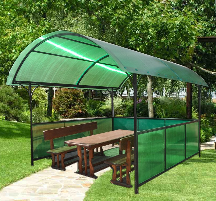 Секрет красивой беседки из поликарбоната — использовать карбонат как дополнение к беседке (крыша, перегородки, укрытие), а не основу всей конструкции.