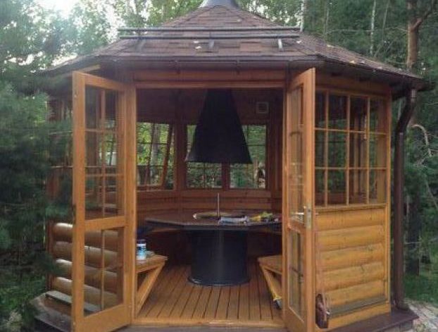 Приготовление мяса на углях внутри беседки — интересная ли это идея для дачи? Много ли подобных сооружений, с оборудованным внутри грилем, вы видели у ваших знакомых и друзей?