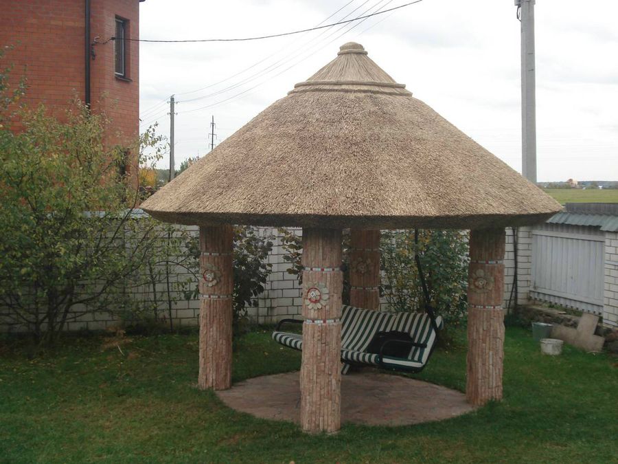 Не особо часто я вижу подобный материал как кровельное покрытие беседок, но выглядит оно очень эффектно.