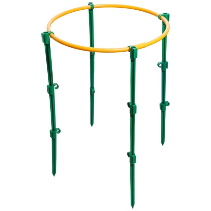 Оно может считаться неплохим, если сделано из толстого металла, и кольцо не разгибается от давления. Недостаток — неустойчивость конструкции, если куст начинает перевешивать на одну сторону. Неудобно устанавливать на уже разросшееся растение – приходится подгибать край кольца и просовывать ветви внутрь. |