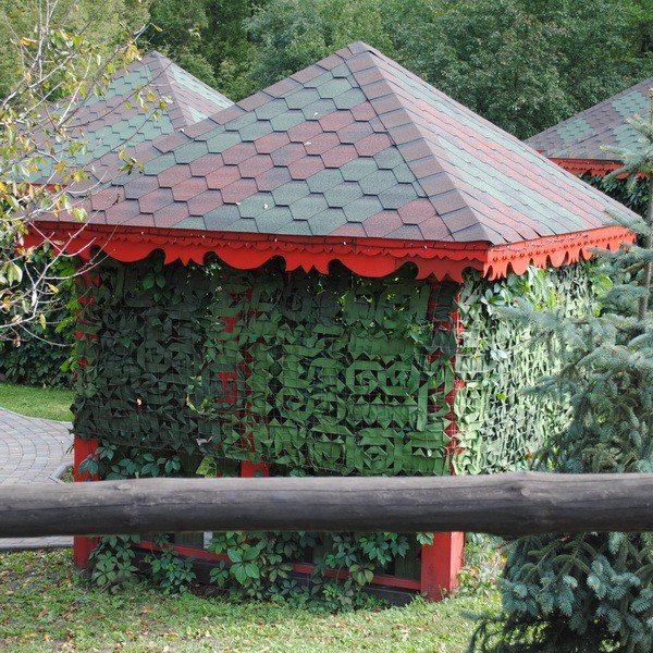 По моему личному мнению, это довольно «колхозный» вариант для защиты, но весьма практичный и эффективный. Благодаря камуфляжной сетке внутрь беседки будет проникать гораздо меньше солнечного света, благодаря чему можно будет добиться прохлады в этом небольшом помещении даже в самую жаркую погоду.