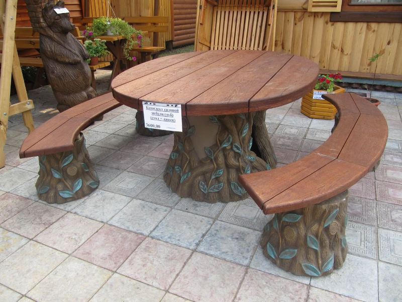 Подобные пары стола и скамеек вы могли видеть на городских улицах, парках и скверах. Чаще всего это металлическое основание и деревянная столешница (если речь о столе) или деревянное сидение и спинка (если речь о скамье). Такая конструкция позволяет уменьшить размеры мебели, что крайне важно в ограниченном пространстве беседки.