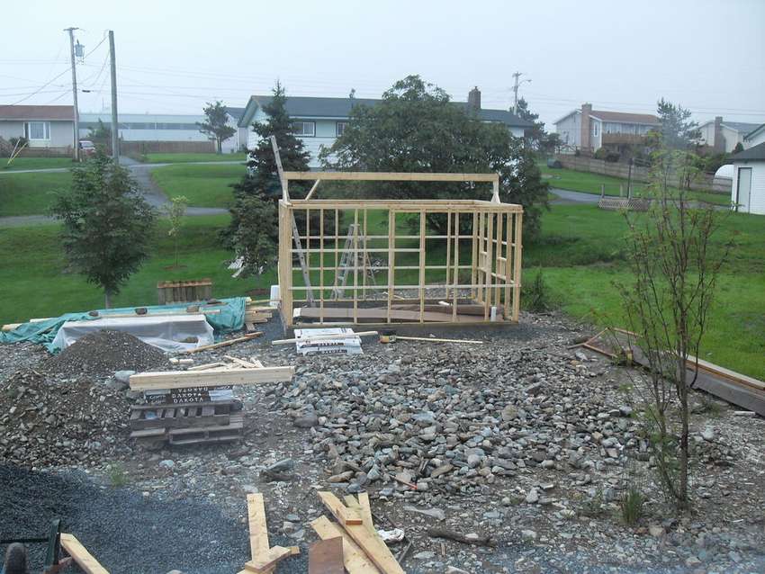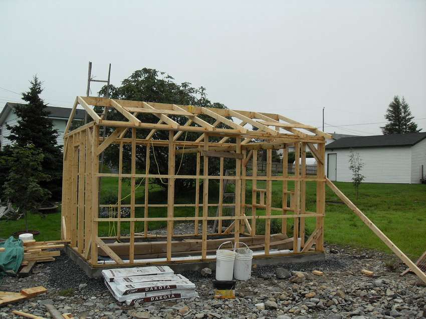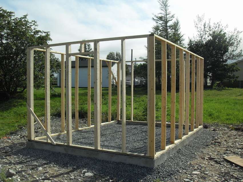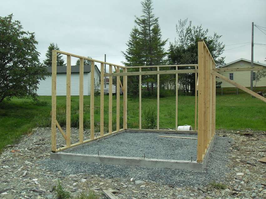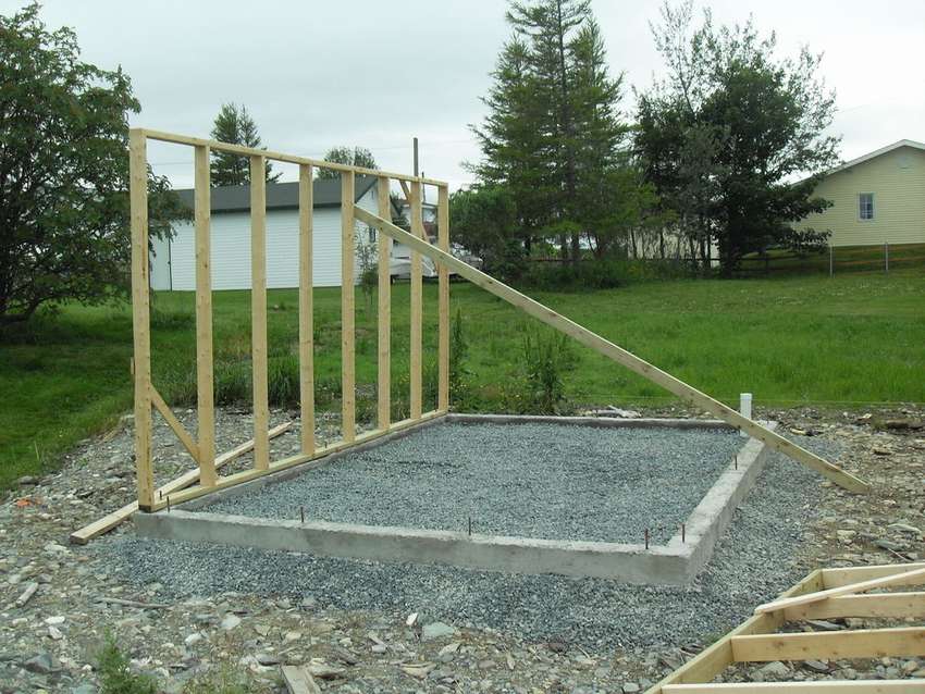 Стены ставят на фундамент и подпирают длинным брусом. |