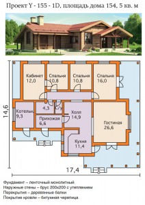 Для небольшой семьи идеально подойдёт деревянный жилой дом площадью порядка 75-80 кв. м. За счёт лёгкости основного строительного материала можно ограничиться возведением простого ленточного фундамента на песчаной подушке. Внутренние и наружные несущие стены изготавливаются из бруса (оцилиндрованного или клеёного). Утепление и облицовку наружных стен при желании можно выполнить с использованием металлосайдинга.